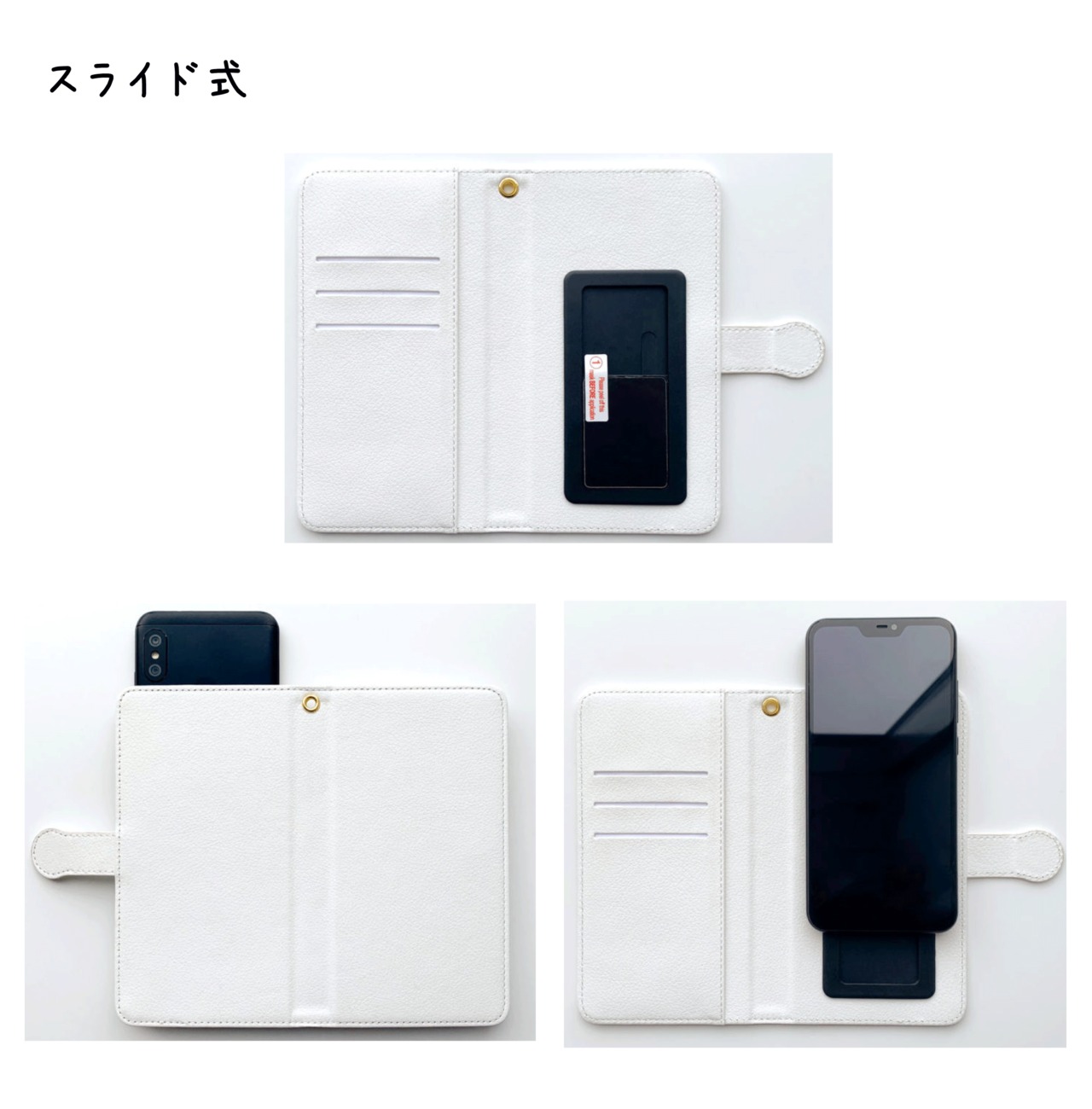 カードが3枚入るポケット付き。スマホを粘着シートで接着。上にスライドするとカメラ撮影可能です。マイク穴、カメラ穴、ミラー、スタンド機能は付いておりません。